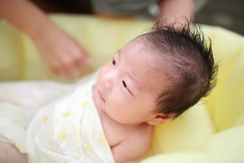 今日もパパはお休み。夕方、一緒に結月ちゃんの沐浴をする。