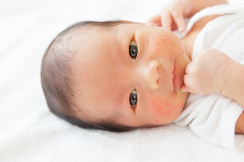 口の周りがよだれや食べこぼしでかぶれやすいのは、刺激を受けた肌が炎症を起こしやすいためです。