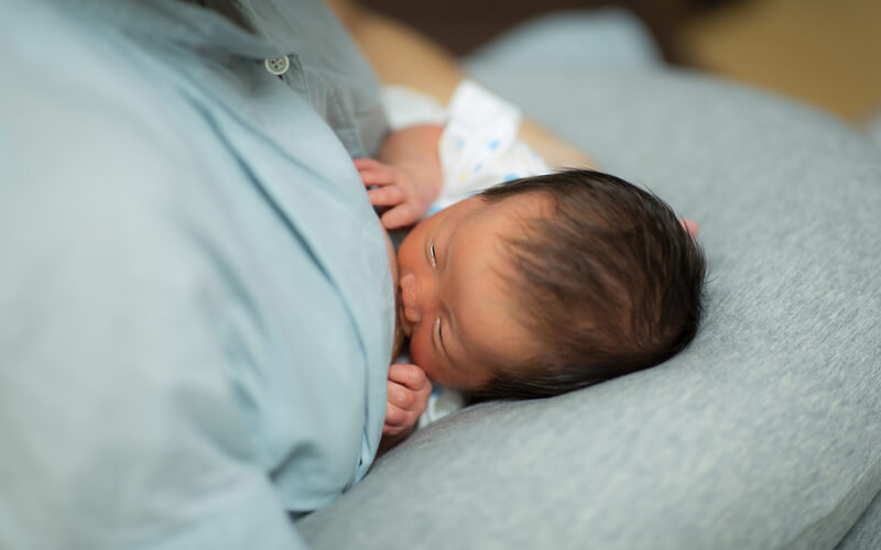 母乳の場合は先にあげるおっぱいの方に赤ちゃんの頭を向かせ、ミルクの場合は利き腕と反対に頭を向けて寝かせましょう。